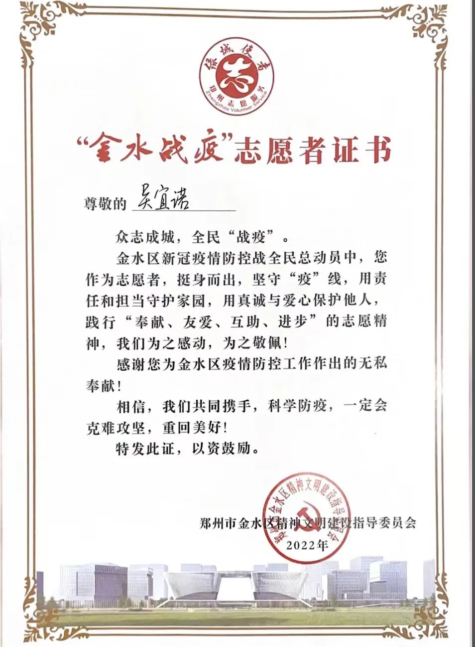 On January 15, Zhengzhou again carried out nucleic acid testing. Due to the lack of community staff, time constraints and heavy tasks, Wu Yinuo took the initiative to apply to participate in the anti epidemic work as a volunteer. On the spot, she works efficiently and always completes tasks in a timely and rapid manner; She works actively and rushes to the front line whenever she has a task; She works patiently. She always answers the questions or criticisms of the masses patiently.