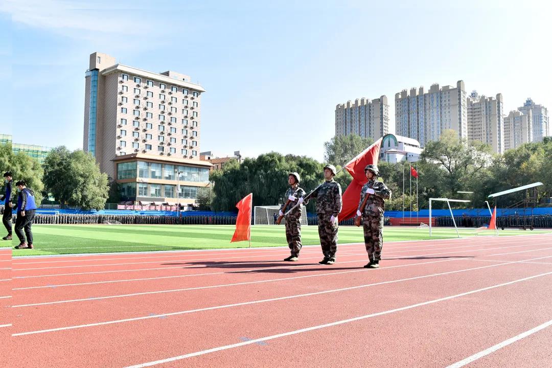 (Li Jiaxuan, class 2 of biology, our college (middle) holds high the "Ba Yi" military flag and marches in the front of all the military training regiments)