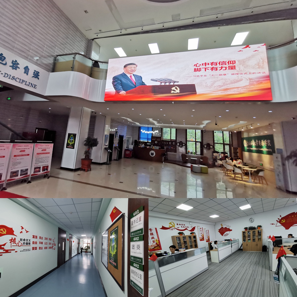 公司党委还将庆祝建党百年与党史学习教育宣传融入日常、抓在经常,将红色元素融入公司公共区域及办公区,并在辅导员办公室中设立党员先锋岗,积极营造全员学习、全员参与的良好氛围,凝聚奋进新征程磅礴力量。公司党委充分利用多媒体设备,将习近平总书记在庆祝中国共产党成立100周年“七一勋章”颁授仪式上的重要讲话金句展播在公司一楼电子大屏上,激励师生党员埋头苦干、攻坚克难,努力创造无愧于党、无愧于人民、无愧于时代的业绩。