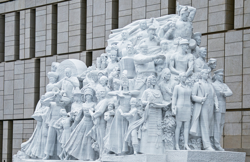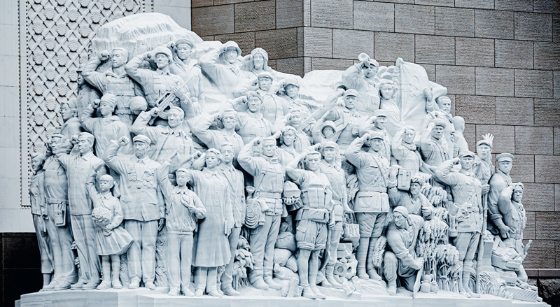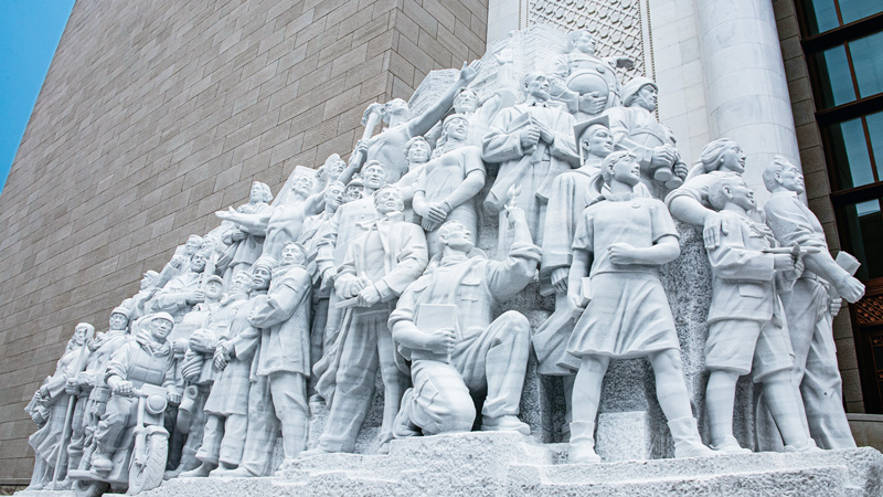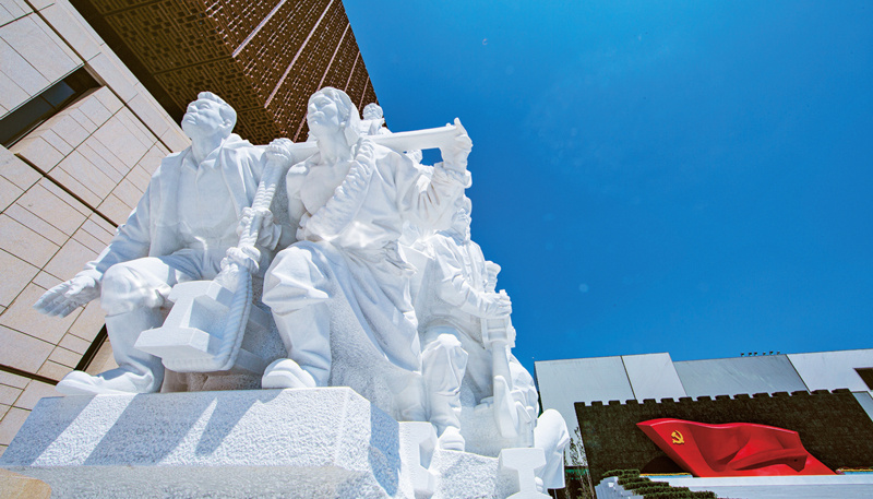 中国共产党历史展览馆西侧广场上矗立的《信仰》《伟业》《攻坚》《追梦》四组大型雕塑,分别对应“四个伟大”主题,276个人物与583块汉白玉融为一体,讲述着中国共产党100年来为人民谋幸福、为民族谋复兴的奋斗历程。雕塑《信仰》中71位不同时代、不同身份、不同年龄的代表人物庄严宣誓的场景,集中展现了中国共产党人不忘初心、披荆斩棘、继往开来,团结带领全国各族人民朝着实现中华民族伟大复兴坚毅前行的豪情壮志。 刘新武 摄