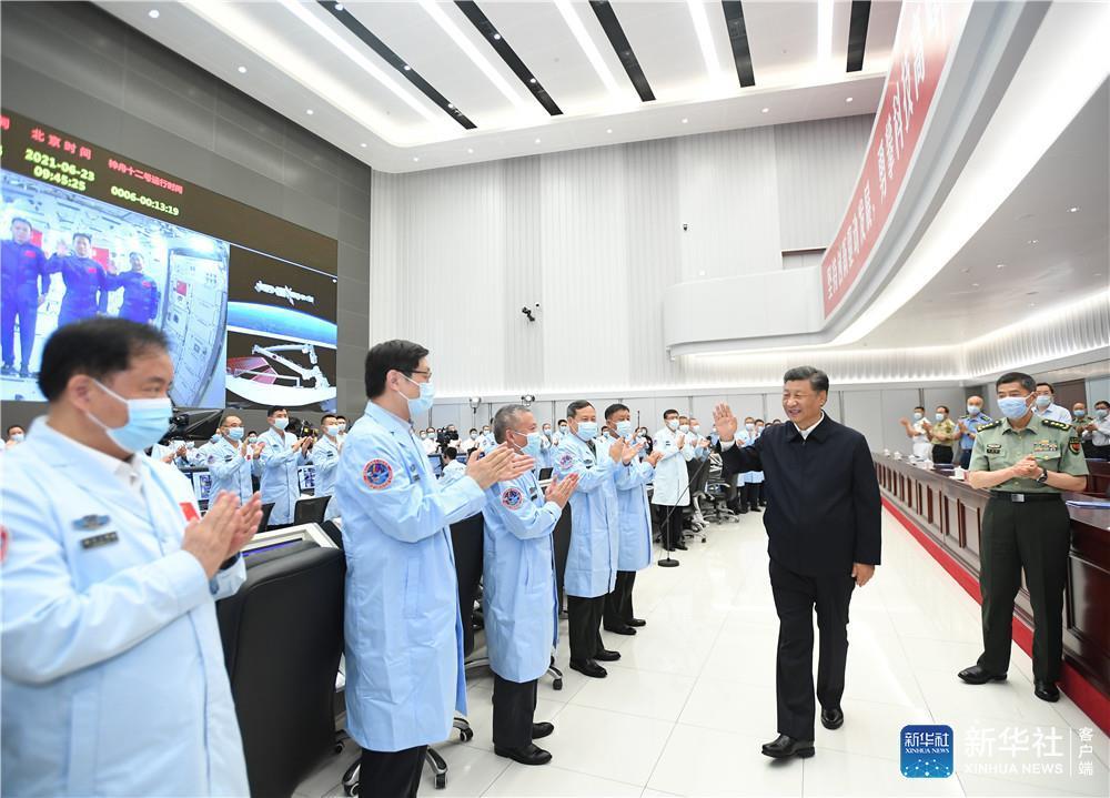 6月23日,中共中央总书记、国家主席、中央军委主席习近平来到北京航天飞行控制中心,同正在天和核心舱执行任务的神舟十二号航天员聂海胜、刘伯明、汤洪波亲切通话。这是通话结束后,习近平向他们挥手致意,向现场参试人员表示慰问。新华社记者 燕雁 摄