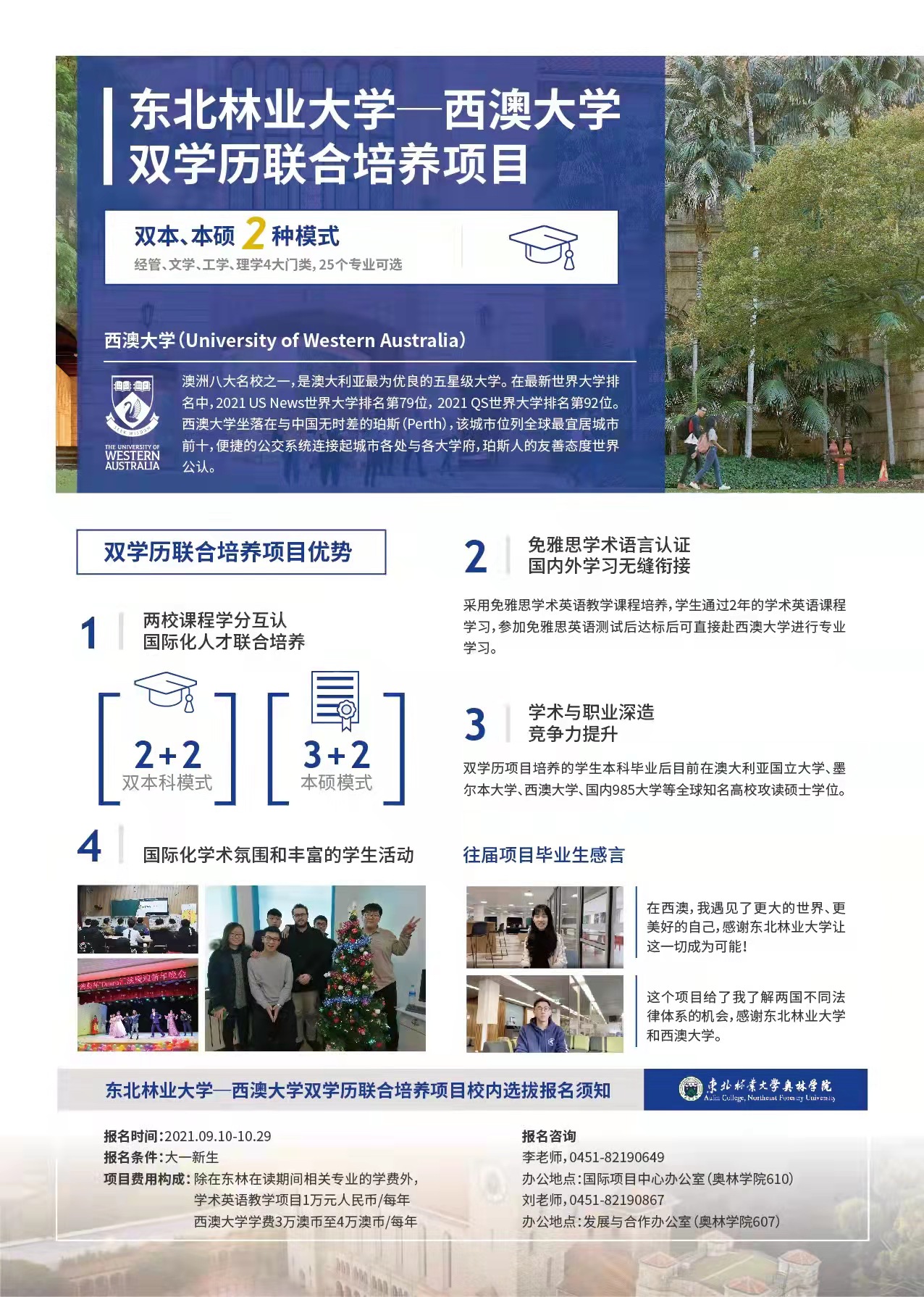 今年伟德国际victor1946——西澳大学双学历培养项目校内选拔已经开始,具体内容及咨询方式如下: