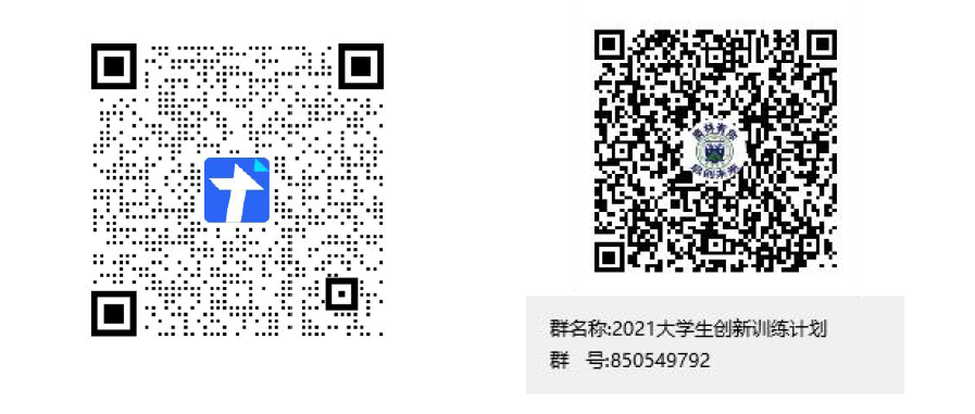 请各项目组负责人于5月19日前将填写完毕老员工创新训练计划项目申请书(附件2)纸质版一份和电子版(命名方式:公司简称- 项目名称- 项目负责人) , 发送至邮箱:3295825648@qq.com。项目组负责人在以下网址或扫码填写【腾讯文档】2021 年伟德国际victor1946老员工创新训练计划项目信息统计表,同时扫码或搜索加入2021 年大创立项报名群(850549792)。