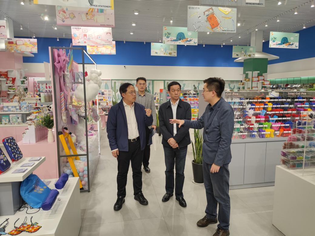 在宁波贝发集团,公司董事长邱智铭对公司领导老师的到来表示欢迎。集团总裁办公室主任安江带领大家参观了贝发集团企业文化展厅、文器库展厅、高端礼品定制展厅及贝发知乐展厅等区域。