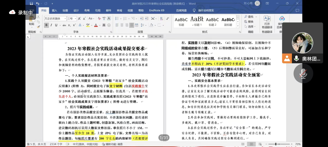 为保证实践活动深入有序开展,充分发挥社会实践的育人优势,本次培训会为同学们介绍了由奥林团委牵头组织的“绿色使命”主题社会实践活动的日程安排,并介绍了实践具体要求和成果提交要求以及活动的安全预案。